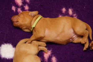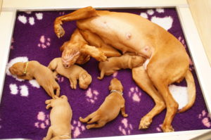 Die Bilder sprechen für sich: Mutter und Welpen sind glücklich, zufrieden und fühlen sich pudel- sorry – vizslawohl, wie man den entspannten Körperhaltungen entnehmen kann…