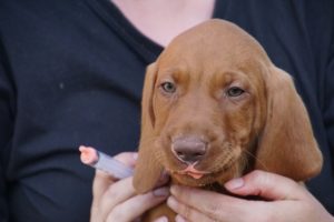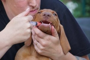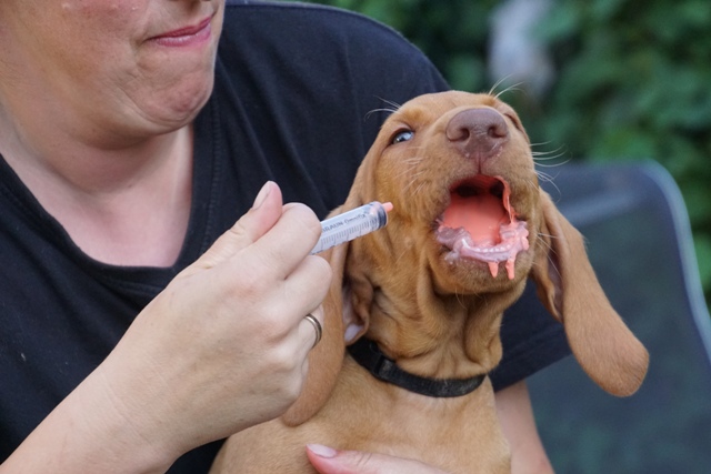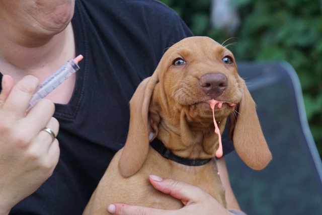 … ja, bis die Wurmkur kam… Es war die zweite und somit letzte Wurmkur für die Welpen hier bei uns. Es war zwar nicht mehr so eine Riesenkleckerei wie vor zwei Wochen, die Welpen haben es sogar mit Fassung ertragen, aber lecker scheint immer noch anders zu sein 😉