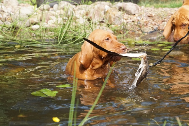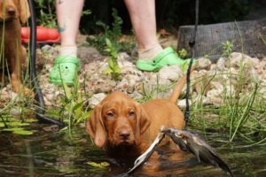 Also wieeder rein in den Teich… Mal mit Entenschwinge als Reiz, mal einfach so, weil’s Spaß macht… Auch der Gartenschlauch ist ein sehr beliebtes Objekt geworden und sorgt für viel Spaß. Da steckt man dann auch schon mal den ganzen Kopf unter den Wasserstrahl und findet das witzig 🙂