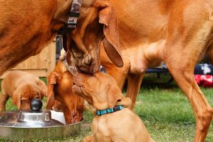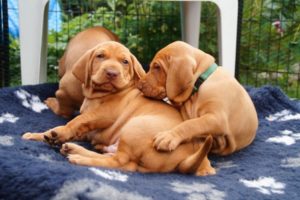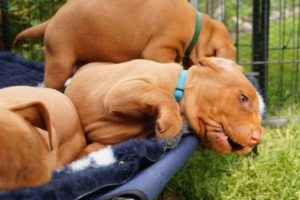 Es kommt nun auch immer häufiger zu kleinen „Streitereien“. Denn nun wehrt sich das Gegenüber, wenn es von seinem Geschwisterchen gebissen wird. Da wird schon mal ordentlich geknurrt und zurückgezwickt. So lernen die Welpen, dass eine Aktion eine Reaktion hervorruft. Konkret in diesem Fall: so entsteht die Beißhemmung….