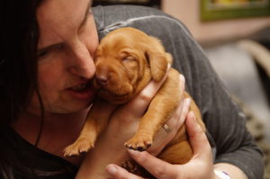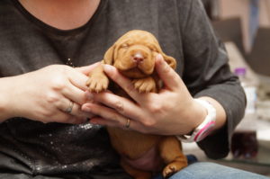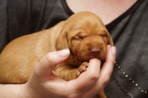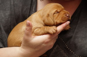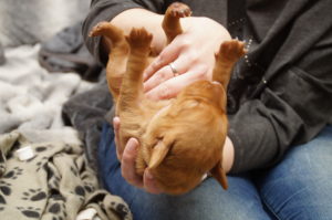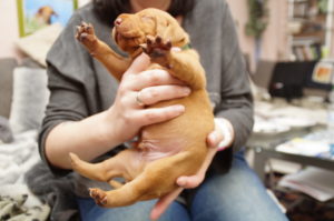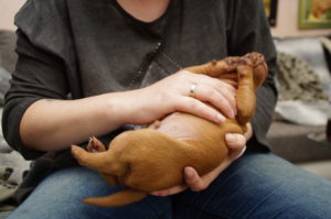 Wir machen diese „Übungen“ nicht täglich mit den Welpen, aber doch ab und an. Auch Enie sorgt für eine ganz natürliche Stimulation der Welpen, da sie als eine wirklich sehr gute Mutter sich hervorragend um ihren Nachwuchs kümmert. Beim Belecken z.B. stupst sie sie um, so dass die Kleinen hin- und herrollen, mal umfallen oder sie in einer ganz anderen Ecke der Wurfkiste landen (und sie dann den Weg zurück „finden“ müssen – was sie natürlich problemlos schaffen). Auch das ist milder Stress, auch deshalb ist es wichtig, dass sich Hundemütter gut und intensiv um ihren Nachwuchs kümmern.