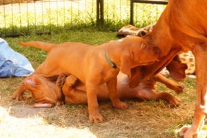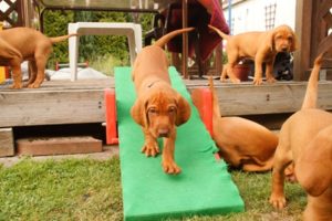 Toll funktioniert mittlerweile der Komm-Pfiff (Doppelpfiff auf der Pfeife oder so gepfiffen) – aus allen Ecken kommen sie dann angerannt, schließlich wissen sie, dass sie dann eine Belohnung bekommen. Dass das so gut funktioniert muss sein – sonst würde man es wohl nie schaffen, die Welpen wieder „einzusammeln“… Die Grundlagen für das Kommen haben wir also bereits gelegt – die neuen Besitzer müssen nur noch drauf Aufbauen und eben dranbleiben.