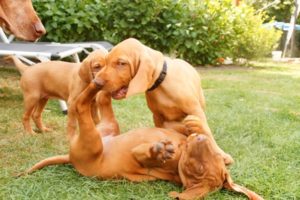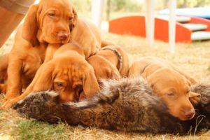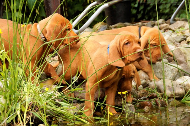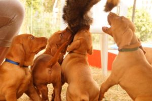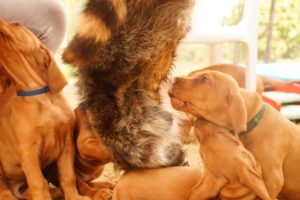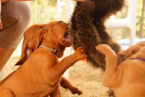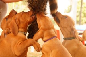 Richtig Leben kam erst in die Welpenbande, als ein Waschbärbalg in’s Spiel kam: da wurde gepackt, gezerrt und auch schon mal gebeutelt. Kleine Mini-Jagdhunde eben 😀