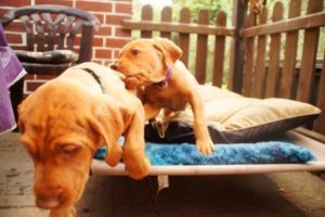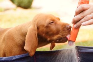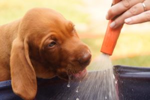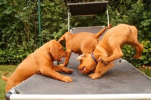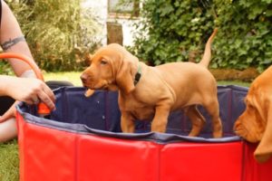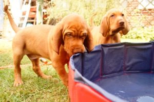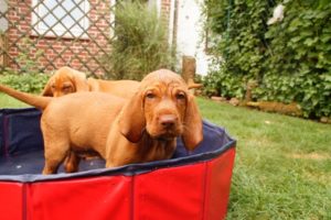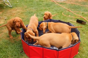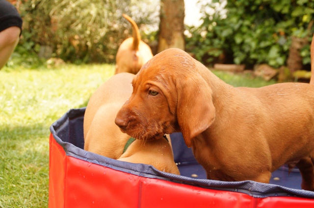 Bei wieder über 30°C haben wir heute mal den neuen Welpenpool eingeweiht. Den Wasserschlauch finden sie ja eh‘ alle gut, der Pool wurde durch eine Handvoll Leckerli – in’s Wasser geworfen – so richtig interessant 🙂
