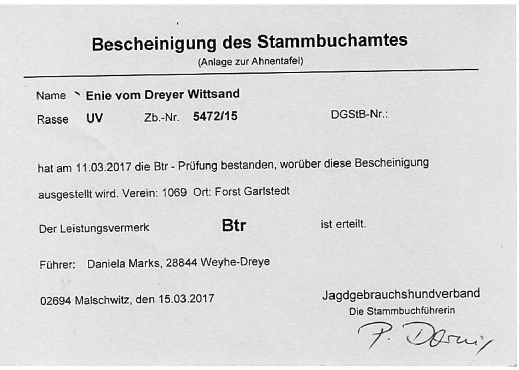 Enie besteht am 11.03.2017 die BTR im JGV Osterholz