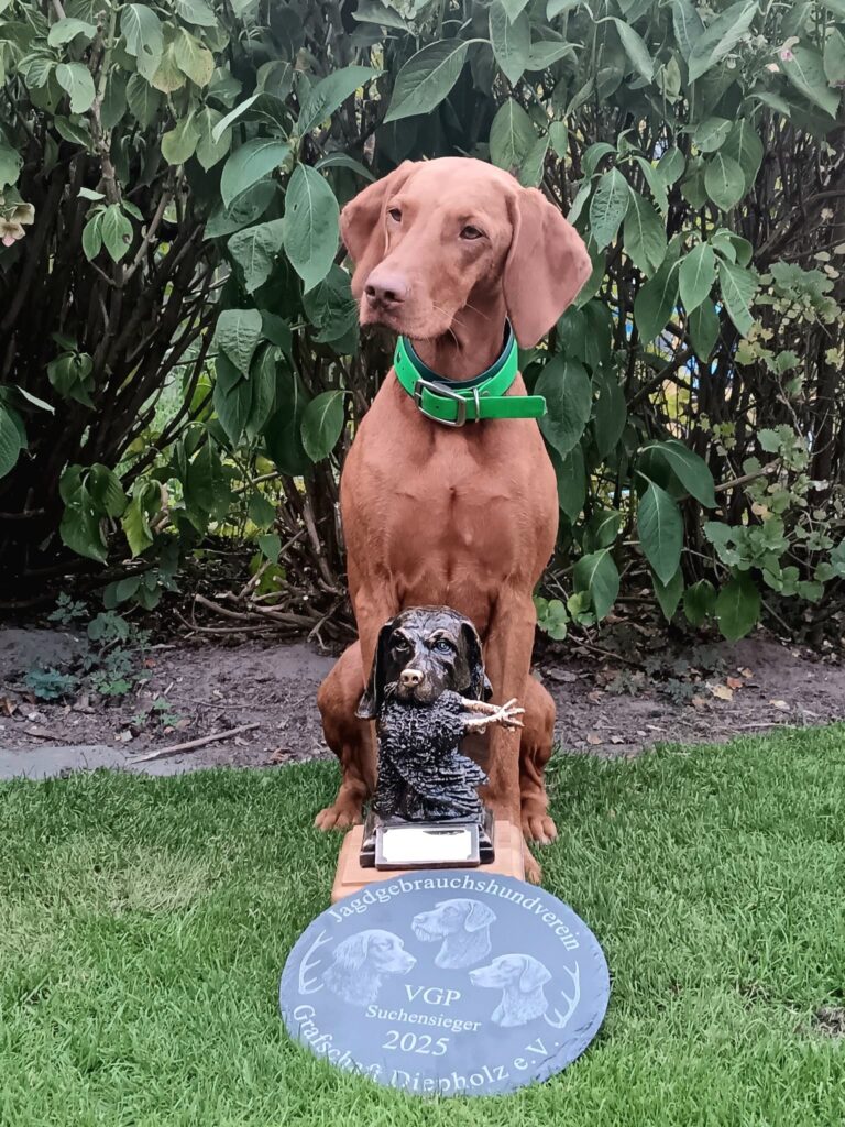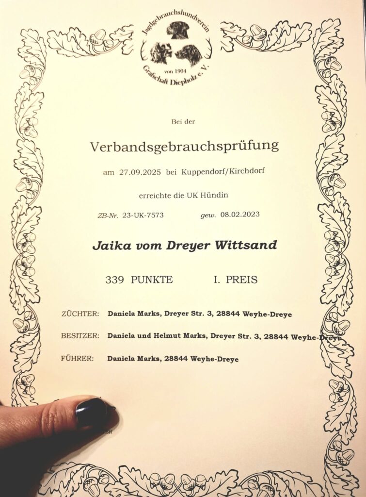Am 27./28.09.2025 besteht Jaika beim JGV Diepholz die VGP mit Bringselverweisen als Suchensiegr mit 339 Punkten (ÜF) im I. Preis.
