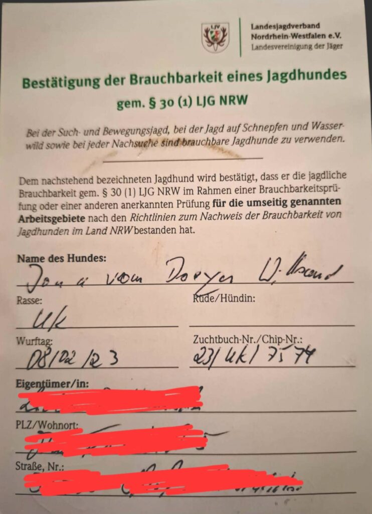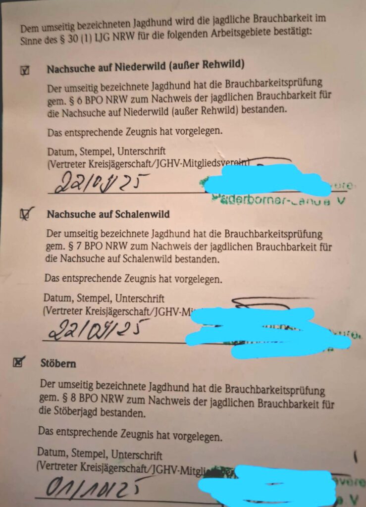 Jona hat am 22.09.2025 die BP Nachsuche auf Nieder- und Schalenwild sowie am 01.10.2025 die BP Stöbern bestanden und ist somit in NRW ein komplett brauchbarer Hund.