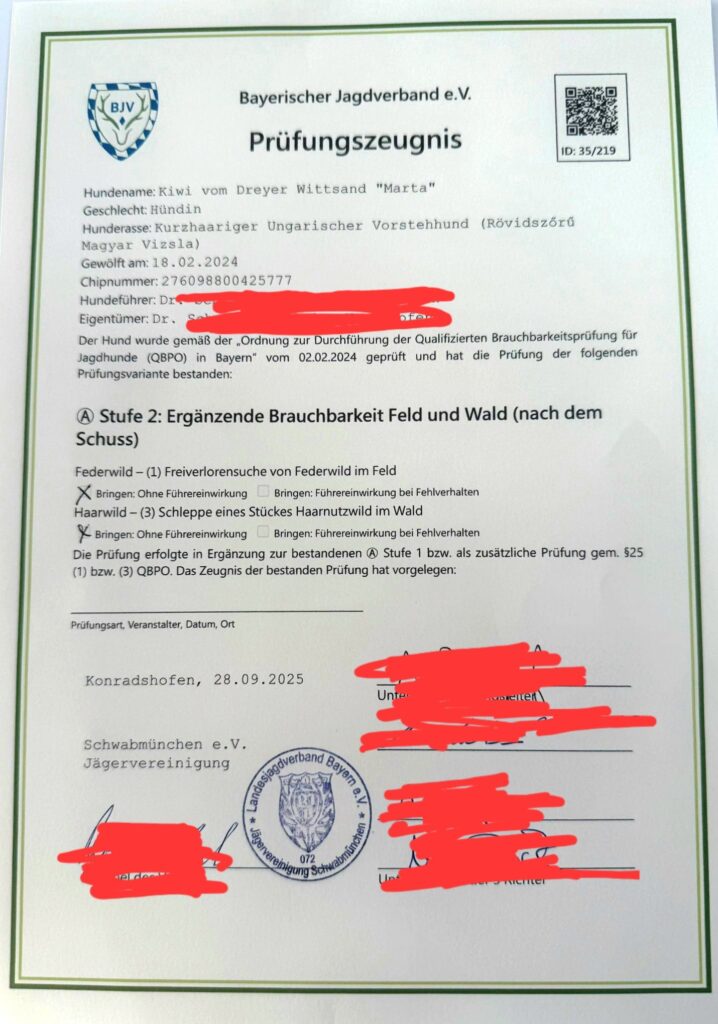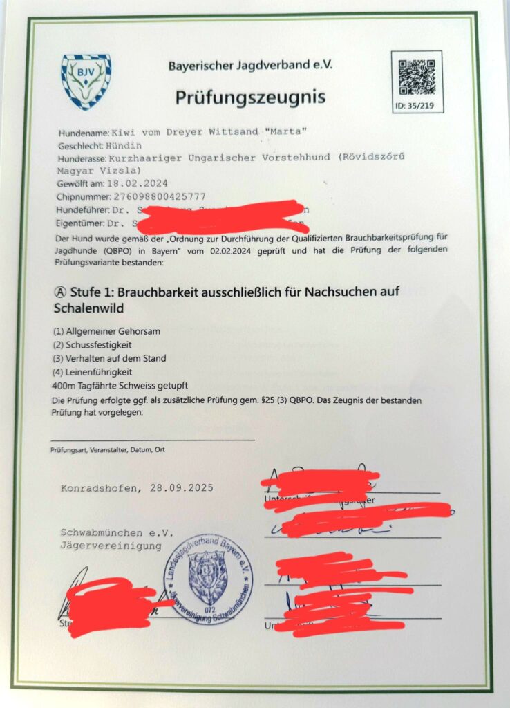 Marta hat am 28.09.2025 die BP zur Nachsuche auf Schalenwild sowie die BP Feld und Wald (nach dem Schuss) bei der Jägervereinigung Schwabmünchen bestanden.