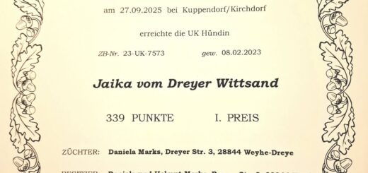 Am 27./28.09.2025 besteht Jaika beim JGV Diepholz die VGP mit Bringselverweisen als Suchensiegr mit 339 Punkten (ÜF) im I. Preis. Wir sind so stolz auf unsere große Kleine 🙂