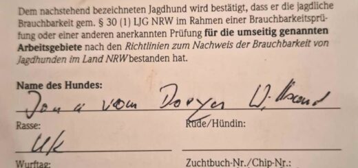 Jona hat am 22.09.2025 die BP Nachsuche auf Nieder- und Schalenwild sowie am 01.10.2025 die BP Stöbern bestanden und ist somit in NRW ein komplett brauchbarer Hund. Ganz herzlichen Glückwunsch!