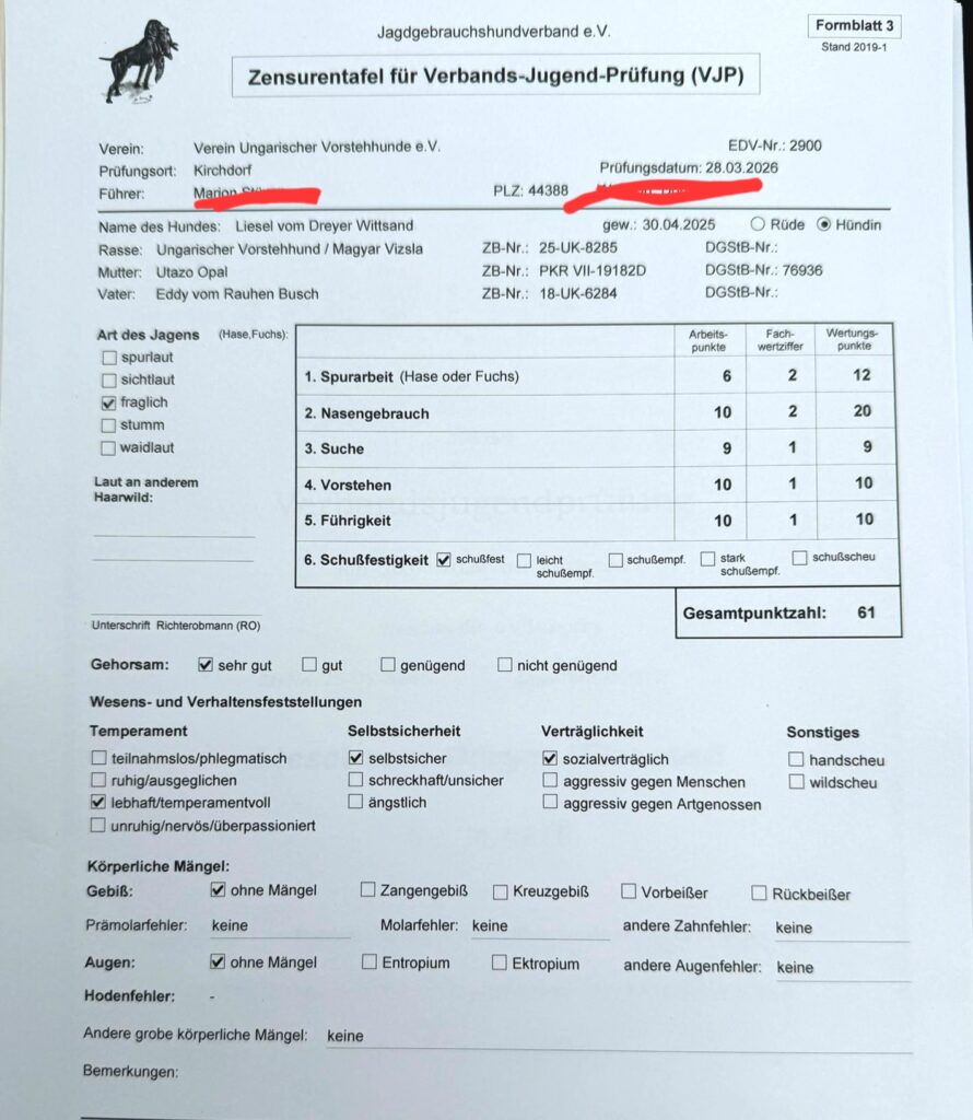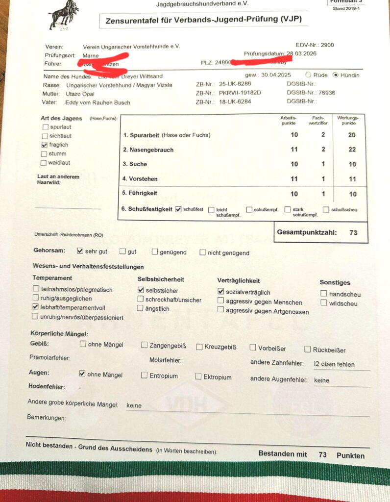 Am 28.03.26 hat Lilo ihre VJP mit hervorragenden 73 Punkten als Suchensieger beim VUV LG Nordmark absolviert.
