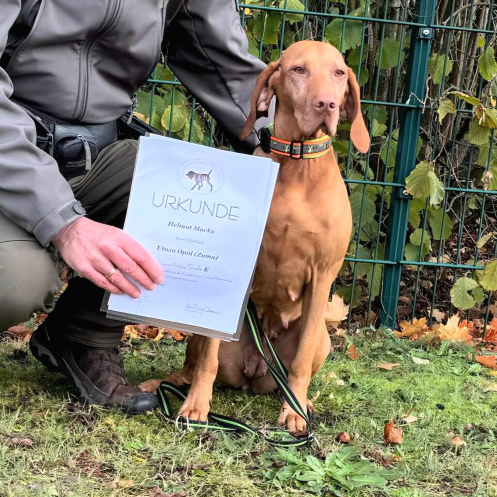 Auch Zuma hat am 26.10.2025 eine Mantrailing Prüfung bestanden. Es war ihre erste, sie hat Stufe „E“ = Einsteiger, bestanden.